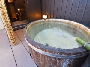 この度、テラスに酒樽を利用した露天風呂を新設しました。